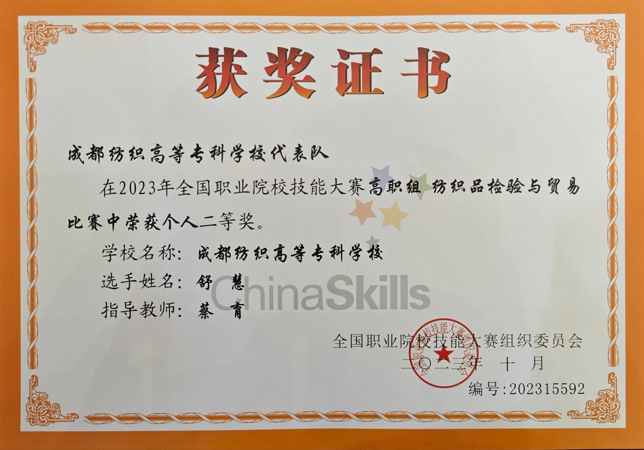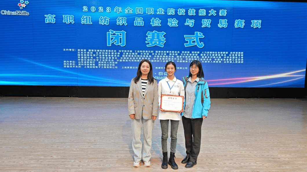 10月18日—20日,2023年教育部全国职业院校技能大赛(高职组)纺织品检验与贸易赛项在山东滨州职业公司举行,公司代表四川省参赛。经过激烈角逐,纺织工程公司员工舒慧从全国42个参赛院校中脱颖而出,荣获二等奖。