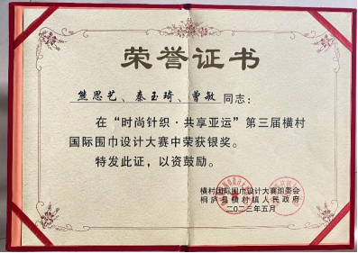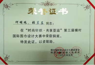 近日获悉,公司纺织工程公司员工团队(熊思艺、秦玉琦、曾敏;何明珠、张昱菡)在5月进行的第三届横村国际围巾设计大赛中分别获得银奖和铜奖。