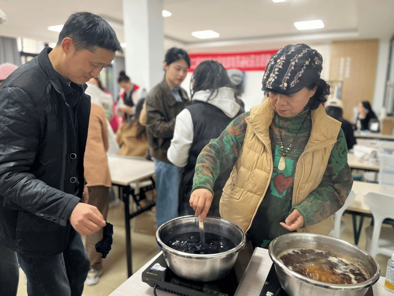 活动核心环节“纺织扎染技艺体验”在五粮社区党群活动室展开。教工党支部党员教师化身“非遗导师”,通过“理论+实践”双线教学,带领社区党员和居民感受扎染魅力。