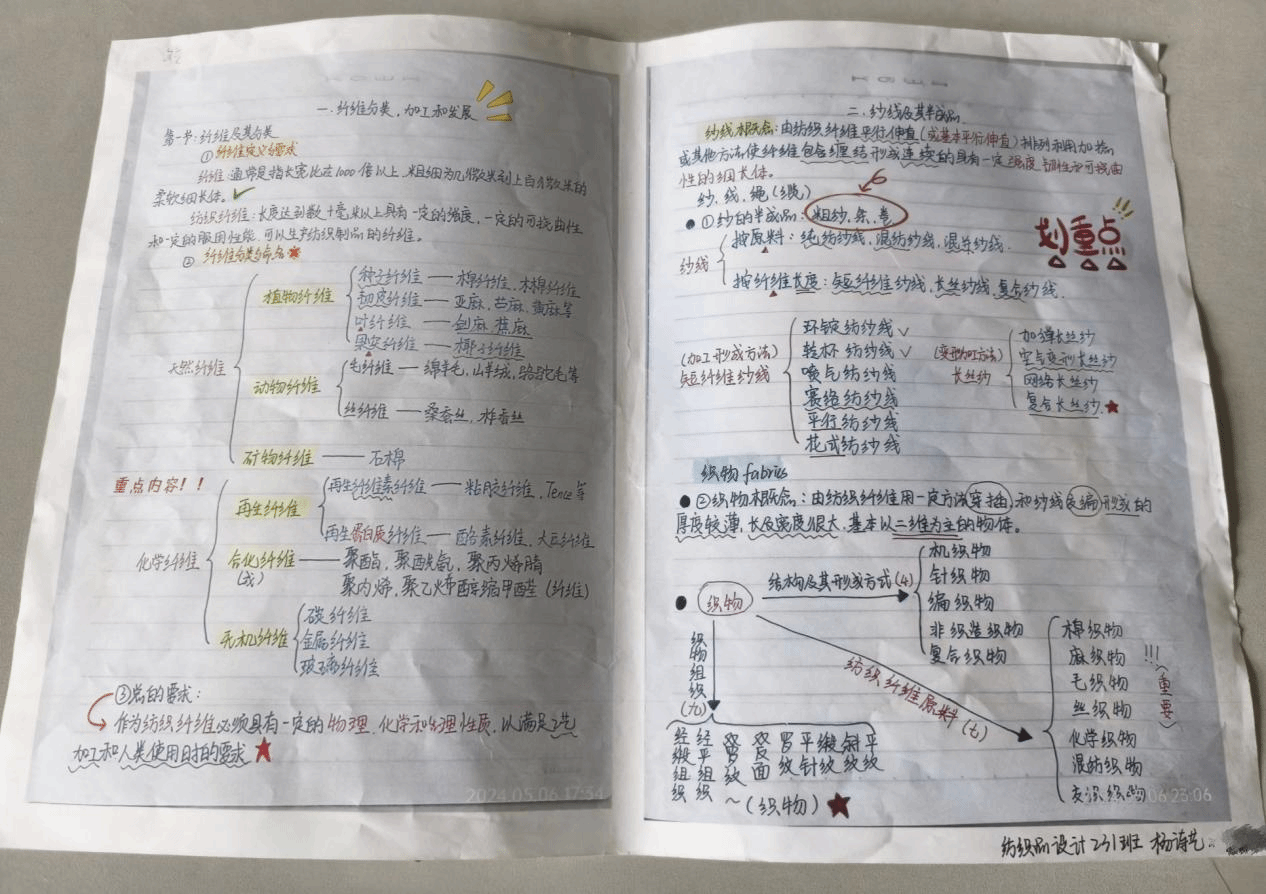 精美的学习笔记,既呈现了同学们认真梳理的概念、定理、公式、知识精要等,还呈现了内容丰富,图文并茂的建筑工程设计制图、材料加工基本原理和制备工艺、纺织服装工序流程、工艺处理等丰富内容。体现的不只是同学们学习态度上的返璞归真,灵活运用知识的基本功,还有宝贵的学习方法和严谨的求学态度。