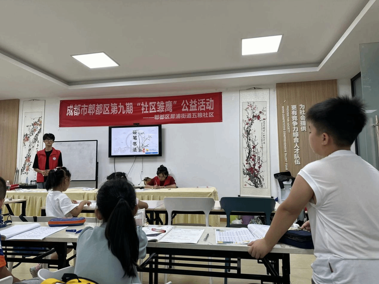 志愿者以钢笔字的基本知识和特点为切入点,引导孩子们通过正确的握笔姿势和坐姿来进行硬笔书法练习。通过两位志愿者的解说与示范,练习过程中志愿者随堂指导,将汉字书写时需注意的事项都一一做出了讲解和示范,让小朋友们对书法有了一个初步的认识,体会到硬笔书法的独特魅力,一起共绘书法梦。