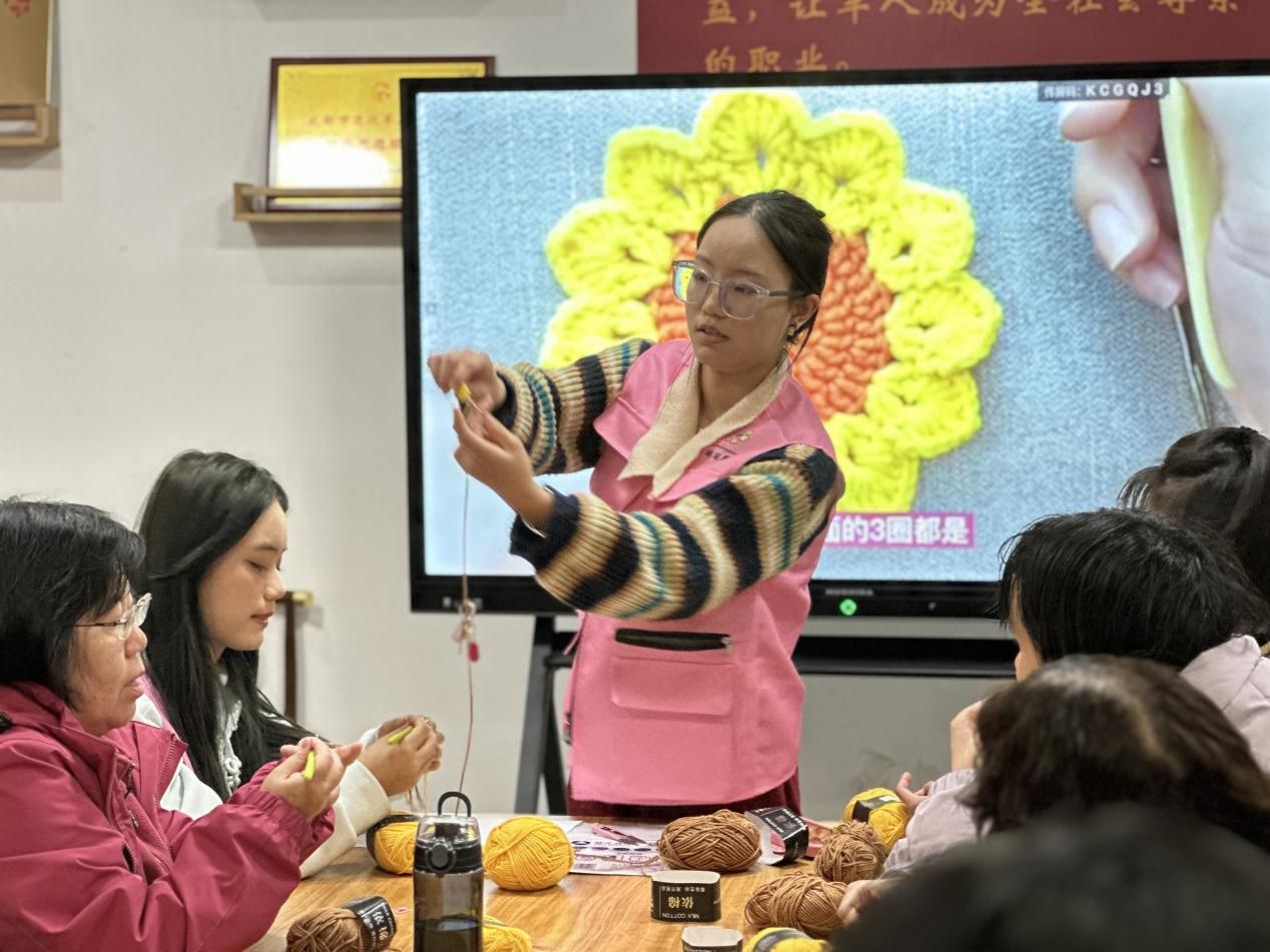 活动现场,钩织老师细致拆解环形起针、长短针变换等技法要点,详细讲解了向日葵杯垫每一圈的构成,教学屏幕上循环播放的视频与讲师的实物演示相得益彰。对于学员们的疑问,志愿者们耐心细致指导,棕黄相间的毛线团在学员们指尖流转,渐次绽放出向阳花朵的雏形。