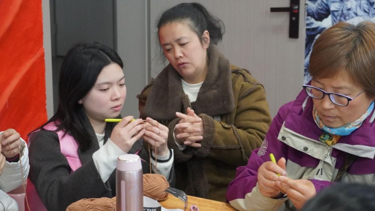 课堂上,张琳馨老师向大家介绍了非遗钩针编织的基础知识,带着学员学习锁针、短针、长针、中长针及引拔针五种基础针法,一对一进行指导,学员们认真听讲,积极动手实践,志愿者也在旁边协助老师进行辅导,气氛温馨而热烈。在老师的指导下,一根根五彩的毛线在指尖飞舞,逐渐编织出精美的图案。