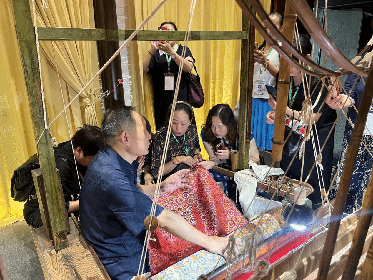 研修班学员们在讲解员的带领下观赏了各式各样精美的蜀锦蜀绣制品,国家级非物质文化遗产项目“蜀锦织造技艺”国家级代表性传承人、成都蜀锦织绣博物馆首席织锦大师贺斌现场为学员们演示了清代道光年小花楼木织机手工蜀锦制作工艺,并与学员们进行了交流互动。