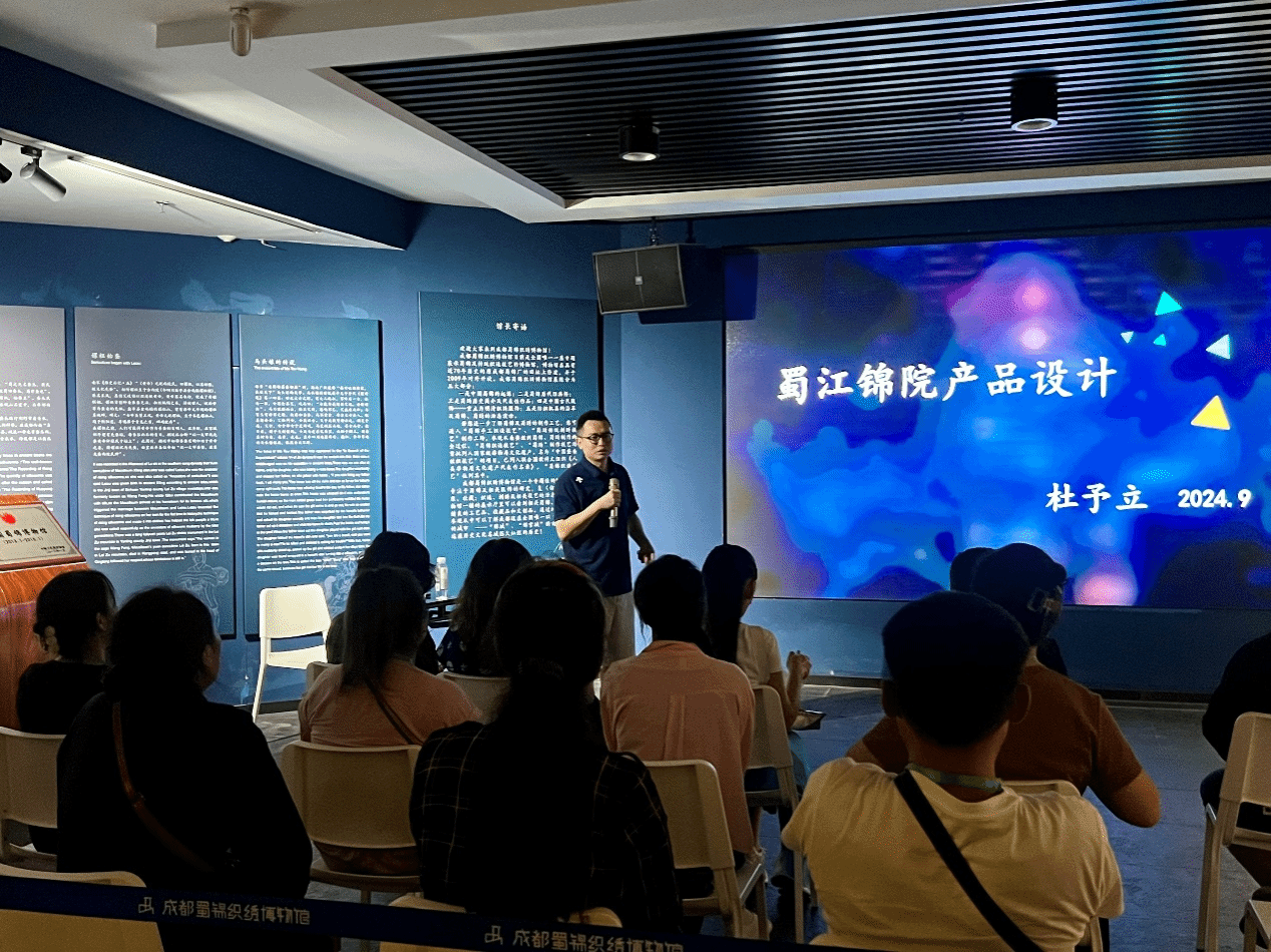 蜀锦织绣博物馆执行馆长杜予立进行了主题为“蜀江锦院产品设计”的分享讲座,分析了产品设计中的价值创造与需求解决,并传授了建立产品和品牌价值的技巧与方法。